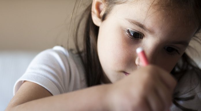 Attentive 5 years old child girl painting with felt-tip pen. Attention deficit hyperactivity disorder concept